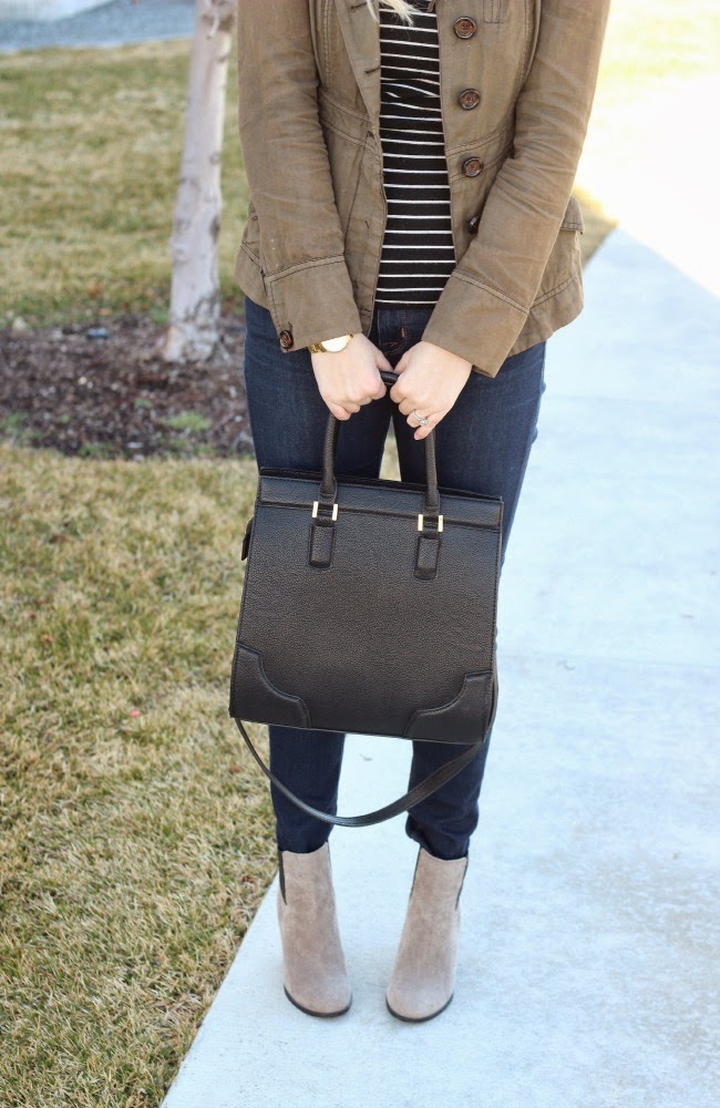 Striped Tee|Banana Republic Military Jacket|Antropologie, similar here & here Jeans|Hudson Booties|Sole Society, Similar Hat|5th and elm, similar Necklace|Mindy Mae's Market Bag|H&M, Similar Watch|Kate Spade